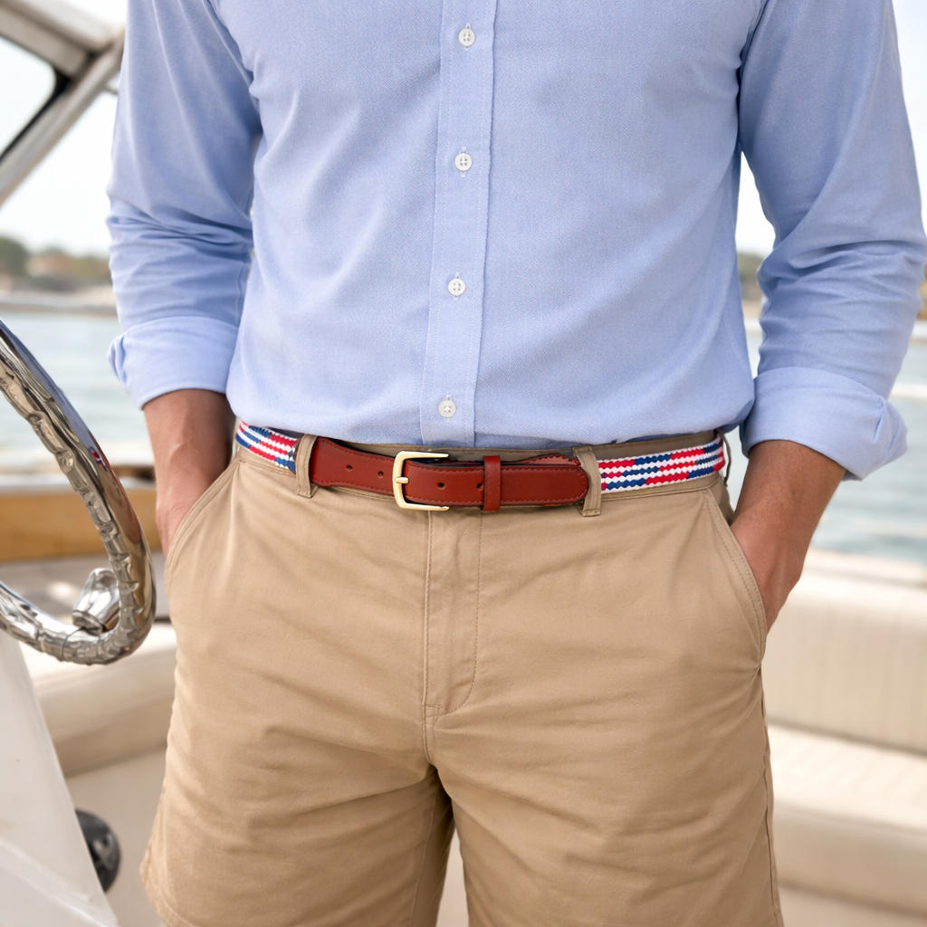 The Friday At Five Belt is the ultimate accessory for unwinding after a week of hard work. Named for the cherished moment when the weekend begins, this belt combines authentic marine-grade yacht braid with the finest vegetable tanned leather - and is most importantly adorned with our countries proud red, white and blue colors…cause ‘Merica!